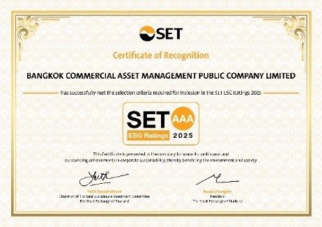 ดร.รักษ์ วรกิจโภคาทร ประธานเจ้าหน้าที่บริหาร BAM เปิดเผยว่า BAM ได้รับผลประเมินหุ้นยั่งยืน SET ESG Ratings ระดับ “AAA” ในกลุ่มธุรกิจการเงิน (Financials) จากการประกาศผลประเมินหุ้นยั่งยืน SET ESG Ratings ประจำปี 2568 ของตลาดหลักทรัพย์แห่งประเทศไทย สะท้อนให้เห็นถึงความมุ่งมั่นในการดำเนินงานของบริษัทฯ ที่ให้ความสำคัญต่อการดำเนินธุรกิจอย่างยั่งยืน ยกระดับการดำเนินงานภายใต้กรอบ ESG ครอบคลุมในทุกมิติ ทั้งด้านสิ่งแวดล้อม สังคม เศรษฐกิจและการกำกับดูแลกิจการ โดยคำนึงถึงผู้มีส่วนได้เสียทุกภาคส่วน ตอบสนองวิสัยทัศน์ “เป็นองค์กรหลักในการพลิกฟื้นสินทรัพย์เพื่อช่วยขับเคลื่อนเศรษฐกิจและสังคมไทยให้เติบโตอย่างยั่งยืน” และแสดงให้เห็นถึงศักยภาพการเติบโตขององค์กรในระยะยาว