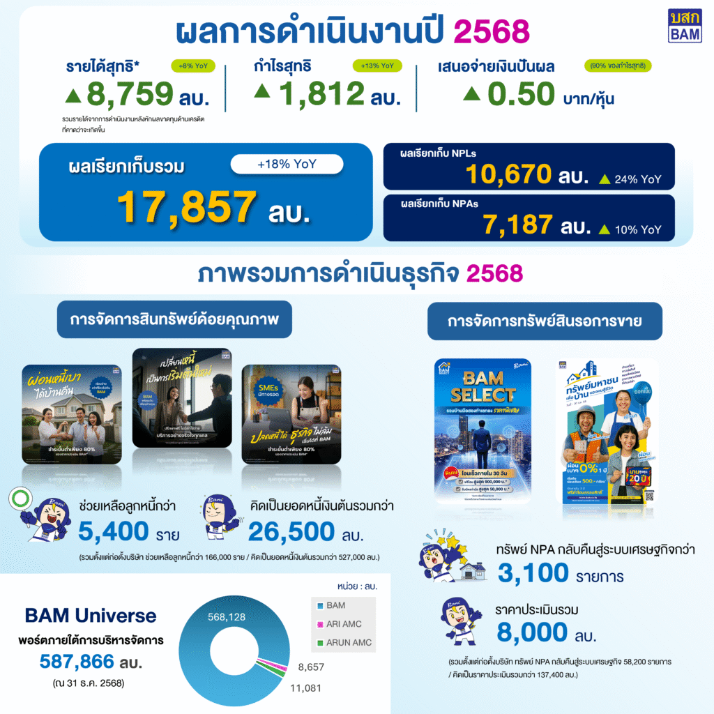 ทั้งนี้ ในปี 2568 บริษัท ฯ สามารถดำเนินภารกิจหลักในการประนอมหนี้และบริหารจัดการทรัพย์สินด้อยคุณภาพกลับคืนสู่ระบบเศรษฐกิจได้อย่างมีประสิทธิภาพ โดยให้ความช่วยเหลือลูกหนี้จำนวนกว่า 5,400 ราย คิดเป็นยอดเงินต้นรวมกว่า 26,500 ล้านบาท พร้อมทั้งจำหน่ายทรัพย์สินได้กว่า 3,100 รายการ มูลค่ารวมกว่า 8,000 ล้านบาท ขณะเดียวกันบริษัทฯ ยังได้ขยายขอบเขตการดำเนินธุรกิจผ่านรูปแบบความร่วมมือเชิงกลยุทธ์ในลักษณะ Joint Venture (JV Model) ภายใต้แนวคิด BAM Universe” ส่งผลให้ปัจจุบันมีพอร์ตสินทรัพย์ภายใต้การบริหารจัดการรวมทั้งสิ้น 587,866 ล้านบาท