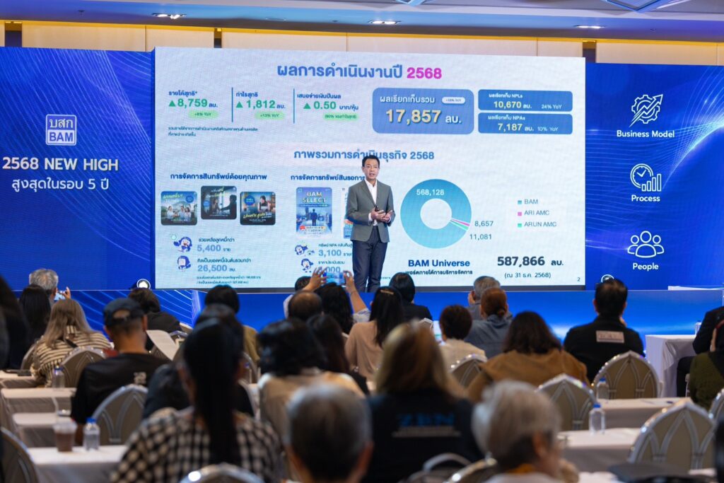 ดร.รักษ์ วรกิจโภคาทร ประธานเจ้าหน้าที่บริหาร บริษัทบริหารสินทรัพย์ กรุงเทพพาณิชย์ จำกัด (มหาชน) หรือ BAM เปิดเผยผลการดำเนินงานปี 2568 ว่าสามารถสร้างผลเรียกเก็บได้มากถึง 17,857 ล้านบาท เมื่อเทียบกับช่วงเดียวกันของปีก่อนที่ทำได้ 15,161 ล้านบาท หรือเติบโตถึง 18% สะท้อนความสามารถในการบริหารสินทรัพย์ภายใต้ภาวะเศรษฐกิจที่ผันผวนได้อย่างมีประสิทธิภาพ โดยผลงานทางด้าน NPL สามารถทำได้ 10,670 ล้านบาท เติบโต 24% จากช่วงเดียวกันของปีก่อนที่ทำได้ 8,630 ล้านบาท ด้วยการเดินหน้าตามแผน กลยุทธ์ให้โอกาสลูกหนี้ได้หลักประกัน ซึ่งเป็นที่อยู่อาศัยหรือที่ทำกินกลับคืนไปด้วยเงื่อนไขที่ผ่อนปรน และมุ่งช่วยเหลือลูกหนี้ให้สามารถฟื้นฟูกิจการหรือสถานะทางการเงินของตน โดยปรับโครงสร้างหนี้และหาทางออกที่ดีที่สุดร่วมกัน ด้วยกระบวนการ Recycling Machine ซึ่งมีเป้าหมายในการเร่งสร้างโรงงานแก้หนี้ (TDR Factory) เพื่อฟื้นฟูให้ลูกหนี้กลับมามีสุขภาพทางการเงินที่ดีขึ้น ขณะที่ผลการดำเนินงาน JV AMCs ของบริษัท บริหารสินทรัพย์ อารีย์ จำกัด และ บริษัท บริหารสินทรัพย์ อรุณ จำกัด สามารถสร้างกำไรสุทธิได้ 107 ล้านบาท และ 87 ล้านบาท ตามลำดับ พร้อมเดินหน้าขยายความร่วมมือด้าน NPL Partnership กับสถาบันการเงินอย่างต่อเนื่อง รวมทั้งการพัฒนาโมเดล JV Window ทั้งในรูปแบบแบ่งปันผลกำไร (Profit Sharing) และโมเดลรับจ้างบริหาร (Servicing Model)