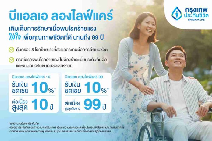 กรุงเทพประกันชีวิต ออกแบบประกันใหม่รับกระแส Longevity กระตุ้นสังคมใส่ใจการมีอายุยืนอย่างมีคุณภาพ ด้วยประกันโรคร้ายแรง บีแอลเอ ลองไลฟ์แคร์ ให้ความคุ้มครอง 8 โรคร้ายแรงที่ส่งผลกระทบต่อการดำเนินชีวิตระยะยาว ให้ความคุ้มครองสูงสุดถึงอายุ 99 ปี เมื่อตรวจพบโรคร้ายแรง ไม่ต้องชำระเบี้ยประกันภัยต่อ พร้อมรับผลประโยชน์เงินชดเชยรายปี 10% ของจำนวนเงินเอาประกันภัย