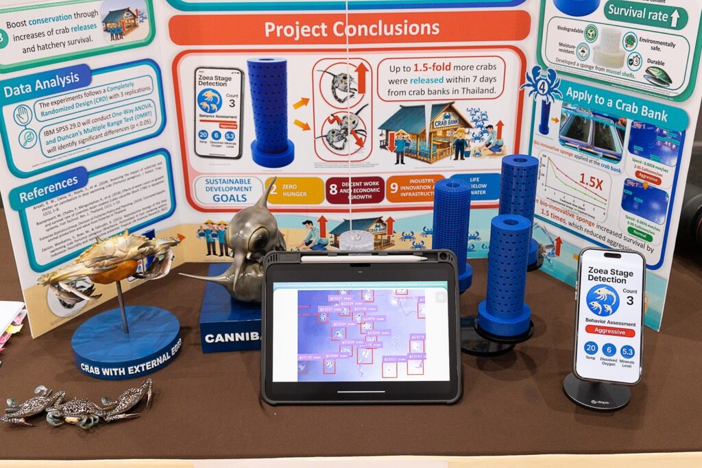 ผลงานนวัตกรรม “Bio-Innovative Sponge to Reduce Cannibalism Behavior for Blue Swimming Crab Conservation and Sustainable Coastal Ecosystems” ดังกล่าวเกิดจากการแก้ไขปัญหาการกินกันเองในช่วงวัยอ่อนของปูม้า ซึ่งเป็นปัญหาหลักที่ทำให้อัตรารอดของลูกปูในธนาคารปูมีเพียง 1% เป็นอุปสรรคสำคัญต่อการฟื้นฟูประชากรปูทะเล นักเรียนเจ้าของโครงการได้ใช้เทคโนโลยี AI Deep Learning (YOLO Algorithm) วิเคราะห์พฤติกรรมก้าวร้าวของปูจากภาพถ่ายกว่า 3,000 ภาพ เพื่อออกแบบ “ฟองน้ำชีวภาพ” ผลิตจาก เปลือกหอยแมงภู่บดผสมพลาสติกชีวภาพ (PLA) ที่จำลองโครงสร้างธรรมชาติของฟองน้ำทะเล เพื่อให้ลูกปูมีพื้นที่หลบซ่อน ลดความเครียด และลดพฤติกรรมการทำร้ายกันเอง