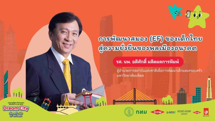 นี่คือประเด็นสำคัญจากการบรรยายหัวข้อ “การพัฒนาสมอง (EF) ของเด็กไทย สู่ความยั่งยืนของพลเมืองอนาคต” โดย รศ. นพ. อดิศักดิ์ ผลิตผลการพิมพ์ ผู้อำนวยการสถาบันแห่งชาติเพื่อการพัฒนาเด็กและครอบครัว มหาวิทยาลัยมหิดล ภายในงาน “ดรีมซิตี้ เมืองสร้างฝัน อีเอฟสร้างคน” ซึ่งจัดขึ้นโดยความร่วมมือของ กลุ่มบริษัท ดาว ประเทศไทย (Dow) กรุงเทพมหานคร สถาบันรักลูก เลิร์นนิ่ง กรุ๊ป (RLG) และพันธมิตร เพื่อสะท้อนภาพการหล่อหลอมเยาวชนไทยให้เติบโตอย่างมีคุณภาพ