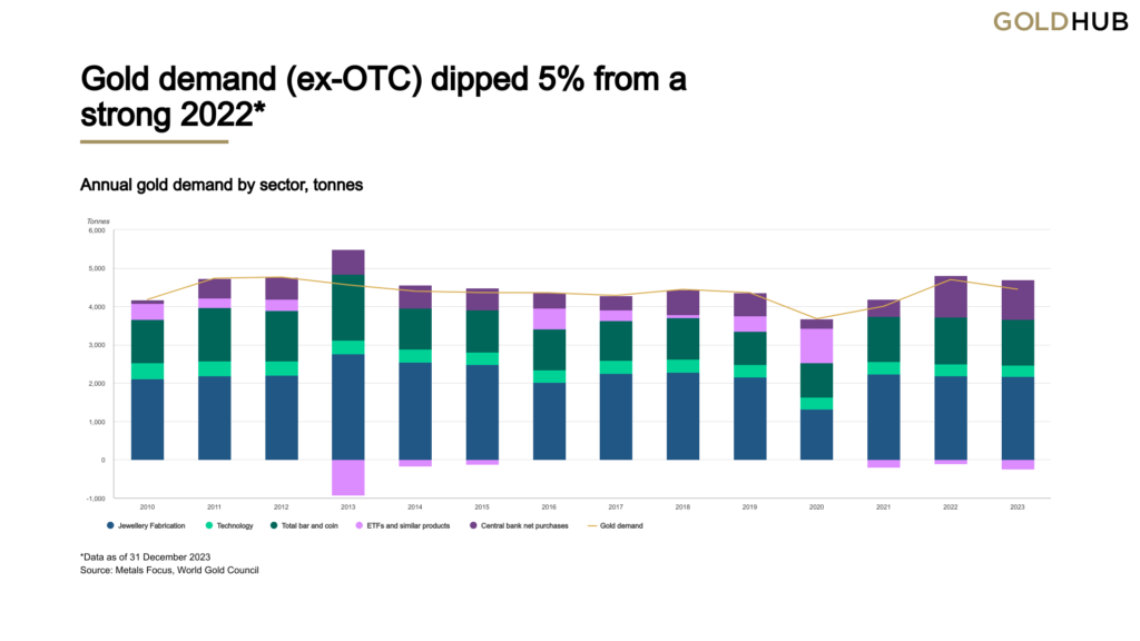 การซื้อทองคำของธนาคารกลางทั่วโลกยังคงอยู่ในระดับสูงต่อเนื่องจากปี 2565 ทำให้จำนวนความต้องการอยู่ที่ระดับ 1,037 ตันในปีที่ผ่านมา ผลักดันให้ยอดรวมตลอดทั้งปีสูงสุดเป็นอันดับสองจากที่มีการบันทึกมาทั้งหมด และลดลงเพียง 45 ตันเมื่อเทียบกับปีก่อนหน้า