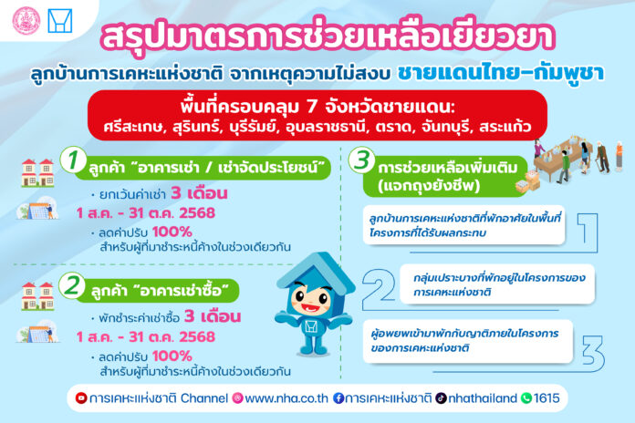 นายทวีพงษ์ วิชัยดิษฐ ผู้ว่าการการเคหะแห่งชาติ เปิดเผยเมื่อวันที่ 4 สิงหาคม 2568 การเคหะแห่งชาติพร้อมยืนเคียงข้างประชาชนในยามวิกฤติ ด้วยมาตรการช่วยเหลืออย่างเป็นรูปธรรม เพื่อบรรเทาภาระค่าใช้จ่ายด้านที่อยู่อาศัย และส่งเสริมความมั่นคงในการดำรงชีวิตของผู้ได้รับผลกระทบมาตรการเร่งด่วนให้ลูกบ้านของการเคหะแห่งชาติใน 7 จังหวัดชายแดน ได้แก่ ศรีสะเกษ สุรินทร์ บุรีรัมย์ อุบลราชธานี ตราด จันทบุรี และสระแก้ว ครอบคลุมความช่วยเหลือหลัก 3 ด้าน ได้แก่ 1. ยกเว้นค่าเช่ารายย่อยและเช่าจัดประโยชน์สำหรับลูกค้าการเคหะแห่งชาติ ฟรีค่าเช่า 3 เดือน ตั้งแต่ 1 สิงหาคม – 31 ตุลาคม 2568 รวมถึงยกเว้นค่าปรับ 100% สำหรับผู้ที่มาชำระหนี้ค้าง ในช่วงเวลาดังกล่าว 2. พักชำระหนี้กลุ่มเช่าซื้อ ลูกค้าเช่าซื้ออาคารของการเคหะแห่งชาติในพื้นที่ที่ได้รับผลกระทบ จะได้รับสิทธิพักชำระค่าเช่าซื้อ 3 เดือน ตั้งแต่ 1 สิงหาคม – 31 ตุลาคม 2568 พร้อมยกเว้นค่าปรับ 100% กรณีที่มาชำระหนี้ค้างเช่นเดียวกัน 3. สนับสนุนการยังชีพ การเคหะแห่งชาติได้จัดเตรียมถุงยังชีพเพื่อช่วยเหลือ 3 กลุ่มหลัก ได้แก่ 1) ลูกค้าที่พักอาศัยในโครงการของการเคหะแห่งชาติในพื้นที่ชายแดน 2) กลุ่มเปราะบางที่อยู่ในโครงการ 3) ผู้ที่อพยพเข้ามาพักอาศัยกับญาติในโครงการเนื่องจากสถานการณ์ความไม่สงบดังกล่าว