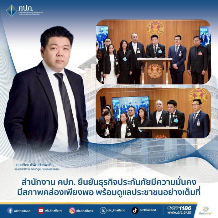 นายชูฉัตร ประมูลผล เลขาธิการคณะกรรมการกำกับและส่งเสริมการประกอบธุรกิจประกันภัย (เลขาธิการ คปภ.) มอบหมายให้นายอดิศร พิพัฒน์วรพงศ์ รองเลขาธิการด้านกฎหมายและตรวจสอบ แถลงข่าวร่วมกับคณะอนุกรรมาธิการตลาดทุนและธุรกิจประกันภัย วุฒิสภา สมาคมประกันวินาศภัยไทย และสมาคมประกันชีวิตไทย โดยสำนักงาน คปภ. ยืนยันธุรกิจประกันภัย มีความมั่นคง มีสภาพคล่องเพียงพอ พร้อมดูแลประชาชนอย่างเต็มที่