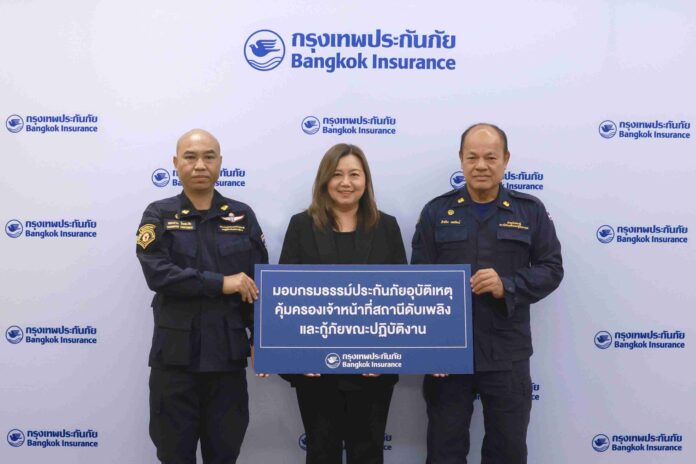 การมอบกรมธรรม์ประกันภัยในครั้งนี้ สะท้อนถึงความมุ่งมั่นของกรุงเทพประกันภัยในการดำเนินธุรกิจควบคู่กับความรับผิดชอบต่อสังคมที่มีความห่วงใยและให้ความสำคัญต่อความปลอดภัยของเจ้าหน้าที่ผู้ปฏิบัติงานเพื่อสังคม พร้อมยืนหยัดเคียงข้างและสนับสนุนบุคลากรที่เสียสละเพื่อประโยชน์ส่วนรวมอย่างต่อเนื่อง