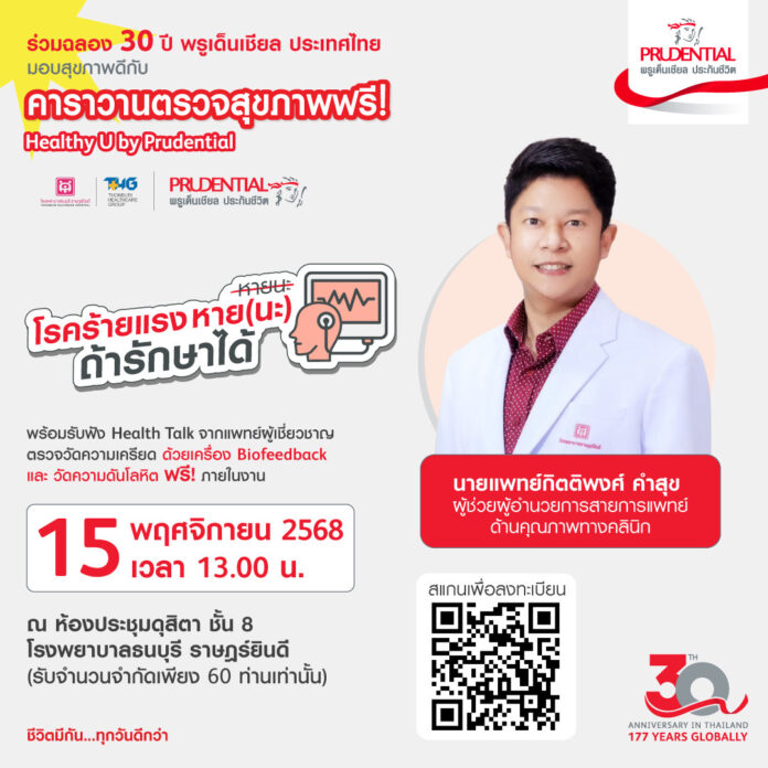 บริษัท พรูเด็นเชียล ประกันชีวิต (ประเทศไทย) จำกัด (มหาชน) หรือ พรูเด็นเชียล ประเทศไทย เดินหน้าสานต่อกลยุทธ์ด้านสุขภาพ “Peace-of-mind Plan” ในการสร้างความอุ่นใจให้กับลูกค้า เพราะ เชื่อว่า “สุขภาพ” ไม่ใช่แค่การรักษา แต่คือการดูแลแบบองค์รวม ตั้งแต่การป้องกัน การส่งเสริมสุขภาพ ไปจนถึงการเข้าถึงบริการที่เหมาะสม ในโอกาสฉลองครบรอบ 30 ปี ของการดำเนินธุรกิจในประเทศไทย พรูเด็นเชียลฯ จึงได้จัดกิจกรรมพิเศษ “Healthy U by Prudential” คาราวานตรวจสุขภาพที่ร่วมมือกับโรงพยาบาลพันธมิตรชั้นนำ ให้คุณได้รับบริการตรวจสุขภาพเบื้องต้นฟรี ไม่มีค่าใช้จ่าย พร้อมรับความรู้ด้านสุขภาพจากแพทย์ผู้เชี่ยวชาญ ในวันศุกร์ที่ 15 พฤศจิกายน 2568 เวลา 13.00 น. ณ ห้องประชุมดุสิตา ชั้น 8 โรงพยาบาลธนบุรี ราษฎร์ยินดี