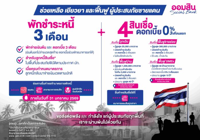ออมสิน จัดเต็มชุดมาตรการช่วยลูกหนี้ในพื้นที่ชายแดน พักหนี้ 3 เดือน – ดอกเบี้ยยกให้ สินเชื่อพิเศษ ดอกเบี้ย 0% ใน 3 เดือนแรก พร้อมจัดงบช่วยเหลือเฉพาะหน้าและงบเยียวยาครอบครัวผู้เสียชีวิต