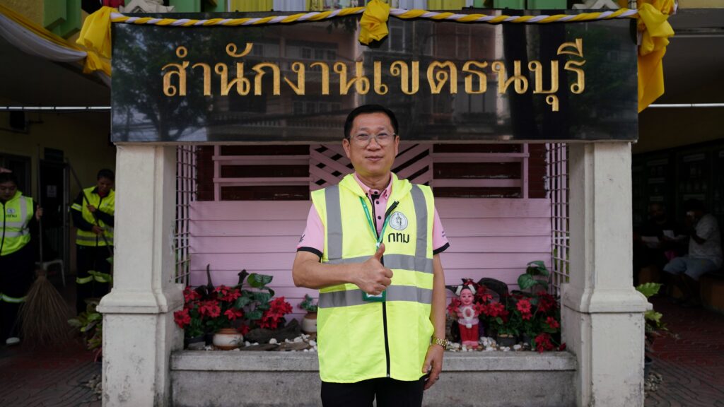 เมืองสะอาดไม่ได้มีเพียง “ไม้กวาด” แต่ยังมีการจัดการตั้งแต่ต้นทาง ว่าที่ร้อยตรี เดชาธร แสงอำนาจ ผู้อำนวยการเขตธนบุรี เล่าว่า สำนักงานเขตเน้นการรณรงค์ร่วมกับผู้ประกอบการในพื้นที่ โดยเฉพาะร้านอาหารกว่า 200 แห่ง ให้แยกเศษอาหารตั้งแต่ต้นทาง ตาม โครงการบ้านนี้ไม่เทรวม ของ กทม.เพื่อให้ปริมาณขยะที่ต้องส่งกำจัดลดลง