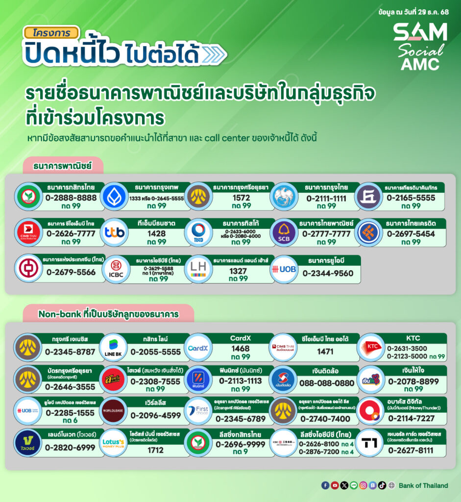 ผู้สนใจสามารถติดตามข่าวสาร หรือสอบถามข้อมูลรายละเอียดเพิ่มเติมได้ที่ SAM Contact Center 1443 กด 6  และ Line: @samsocialamc รวมถึงช่องทาง BOT Contact Center 1213 และสถาบันการเงินเจ้าหนี้เดิมของลูกหนี้