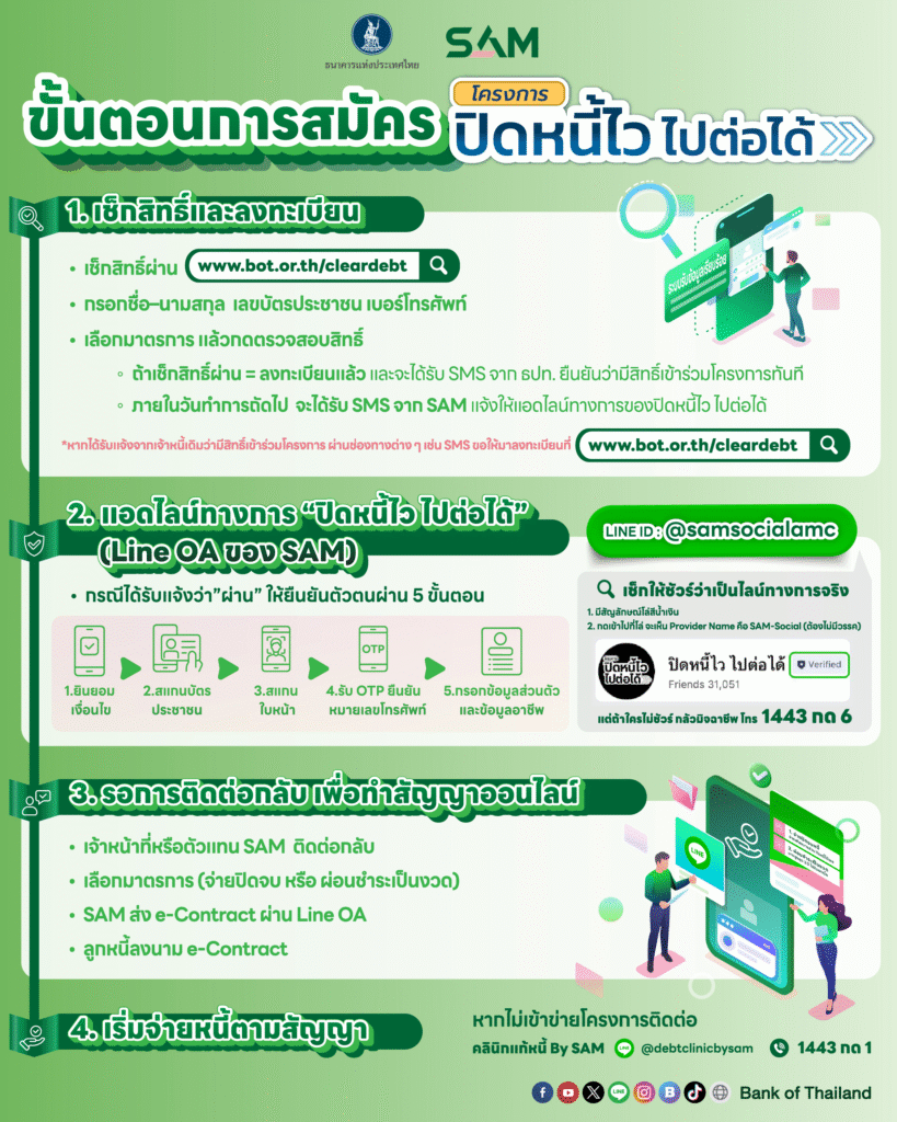 ทั้งนี้ ลูกหนี้สามารถตรวจสอบสิทธิ์เข้าร่วมโครงการได้ด้วยตนเอง แบบ “คลิกเดียวรู้ผลทันที” ผ่านช่องทางหลัก เว็บไซต์ ธนาคารแห่งประเทศไทย (ธปท.) www.bot.or.th/cleardebt และเว็บไซต์ บริษัท บริหารสินทรัพย์สุขุมวิท จำกัด www.sam.or.th เพียงกรอกข้อมูลส่วนตัว อาทิ ชื่อ-นามสกุล หมายเลขบัตรประชาชน หมายเลขโทรศัพท์ให้ครบถ้วน และหากลูกหนี้มีคุณสมบัติครบถ้วนตามเงื่อนไขทีกำหนด ระบบจะลงทะเบียนการเข้าร่วมโครงการให้โดยอัตโนมัติทันที! จากนั้นลูกหนี้จะได้รับการติดต่อผ่านทาง SMS จากธนาคารแห่งประเทศไทย และ SAM เพื่อยืนยันว่ามีคุณสมบัติตรงตามเงื่อนไขและสามารถเข้าร่วมโครงการได้ พร้อมระบุให้ลูกหนี้แอดไลน์ @samsocialamc และยืนยันตัวตน ซึ่งเป็นขั้นตอนสุดท้ายที่สำคัญ สำหรับ 5 ขั้นตอนการยืนยันตัวตนผ่าน Line@socialamc มีดังนี้ 1.กดยินยอม เพื่อเข้าสู่ระบบและกดยินยอมรับเงื่อนไขโครงการ 2. สแกนบัตรประชาชนและสแกนใบหน้า โดยถ่ายรูปบัตรประชาชนเพื่อยืนยันตัวตน 3. รับรหัส OTP เพื่อยืนยันหมายเลขโทรศัพท์ และ 4.กรอกข้อมูลส่วนตัว: ทำการตรวจสอบและยืนยันข้อมูลให้ถูกต้อง จากนั้นรอการติดต่อกลับจากเจ้าหน้าที่เพื่อเข้าสู่กระบวนการปรับโครงสร้างหนี้ เลือกมาตรการปรับโครงสร้างหนี้ไปจนถึงการทำสัญญาและชำระเงินผ่านระบบออนไลน์ให้สำเร็จสมบูรณ์ต่อไป