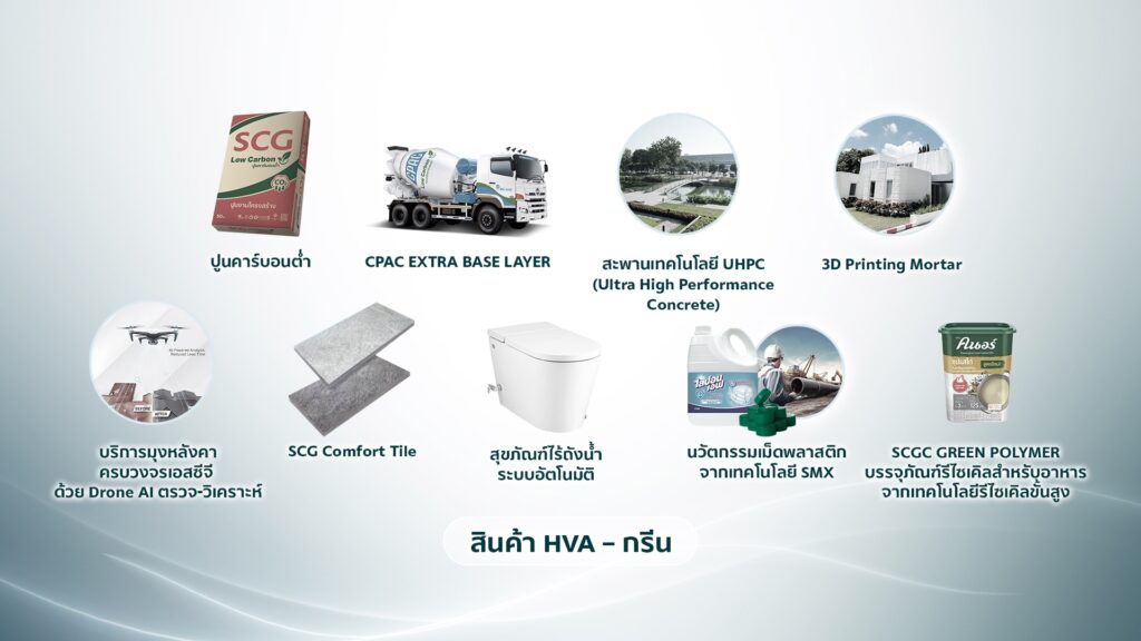 ปูนคาร์บอนต่ำ ปูนคาร์บอนต่ำ อยู่ระหว่างพัฒนาปูนคาร์บอนต่ำรุ่นใหม่ Generation 3 ที่ลดคาร์บอนไดออกไซด์ได้ถึง 38% โดยเตรียมปรับกำลังการผลิต 2 ล้านตัน/ปี ภายในปี 2570 ที่จ.สระบุรีและ CPAC Extra Base Layer นวัตกรรมซ่อม-สร้างถนนลดการยุบตัวและคงตัวทนนานจากการกัดเซาะน้ำ สะพาน UHPC (Ultra High Performance Concrete) สมรรถนะสูง ลดเวลาก่อสร้างได้ถึง 50% 3D Printing Mortar เทคโนโลยีการขึ้นรูปอาคารก่อสร้างที่มีดีไซน์ซับซ้อน ขยายตลาดไปญี่ปุ่น ซาอุดิอาระเบีย และมาเลเซีย ยกระดับ Roof Installation บริการมุงหลังคาครบวงจรเอสซีจี ด้วย Drone AI ตรวจรอยรั่วหลังคาและวิเคราะห์โครงสร้างแบบ 3 มิติ ช่วยให้ซ่อมแซมรวดเร็ว ปลอดภัย และแม่นยำยิ่งขึ้น SCG Comfort Tile กระเบื้องซีเมนต์ปูพื้นรายแรกในไทย ที่ลดความร้อนสะสมได้ 3–7°C ด้วย HeatSync Technology ให้พื้นเย็น เดินสบาย สุขภัณฑ์ไร้ถังประหยัดน้ำ DUACT และแบบ “เคลือบจากเปลือกไข่–หอย” ลดการปล่อยก๊าซเรือนกระจก นวัตกรรมเม็ดพลาสติกจากเทคโนโลยี SMX ช่วยลดความหนาของผลิตภัณฑ์ลงโดยยังคงความแข็งแรง พัฒนาเป็นสินค้าหลากหลาย เช่น ท่ออุตสาหกรรมเหมืองแร่ขนาดใหญ่ ฝาขวดน้ำอัดลม ถังบรรจุสารเคมี และบรรจุภัณฑ์สินค้าอุปโภคบริโภค นวัตกรรมพลาสติกรีไซเคิล ทั้งเทคโนโลยีรีไซเคิลเชิงกล และเทคโนโลยีรีไซเคิลขั้นสูง ซึ่งใช้ผลิตเป็นบรรจุภัณฑ์
