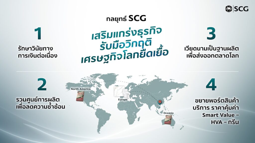 แม้เศรษฐกิจโลกยังเปราะบางและคาดการณ์ยาก เอสซีจีเชื่อมั่นว่ากลยุทธ์การปรับตัวอย่างทันท่วงทีที่ผ่านมา คือ “ภูมิคุ้มกันที่ถูกทาง” เห็นได้ผลการดำเนินงานและ EBITDA ที่แข็งแกร่ง พร้อมเดินหน้า 4 กลยุทธ์หลัก เสริมแกร่งธุรกิจ รับมือเศรษฐกิจโลกยืดเยื้อ ดังนี้