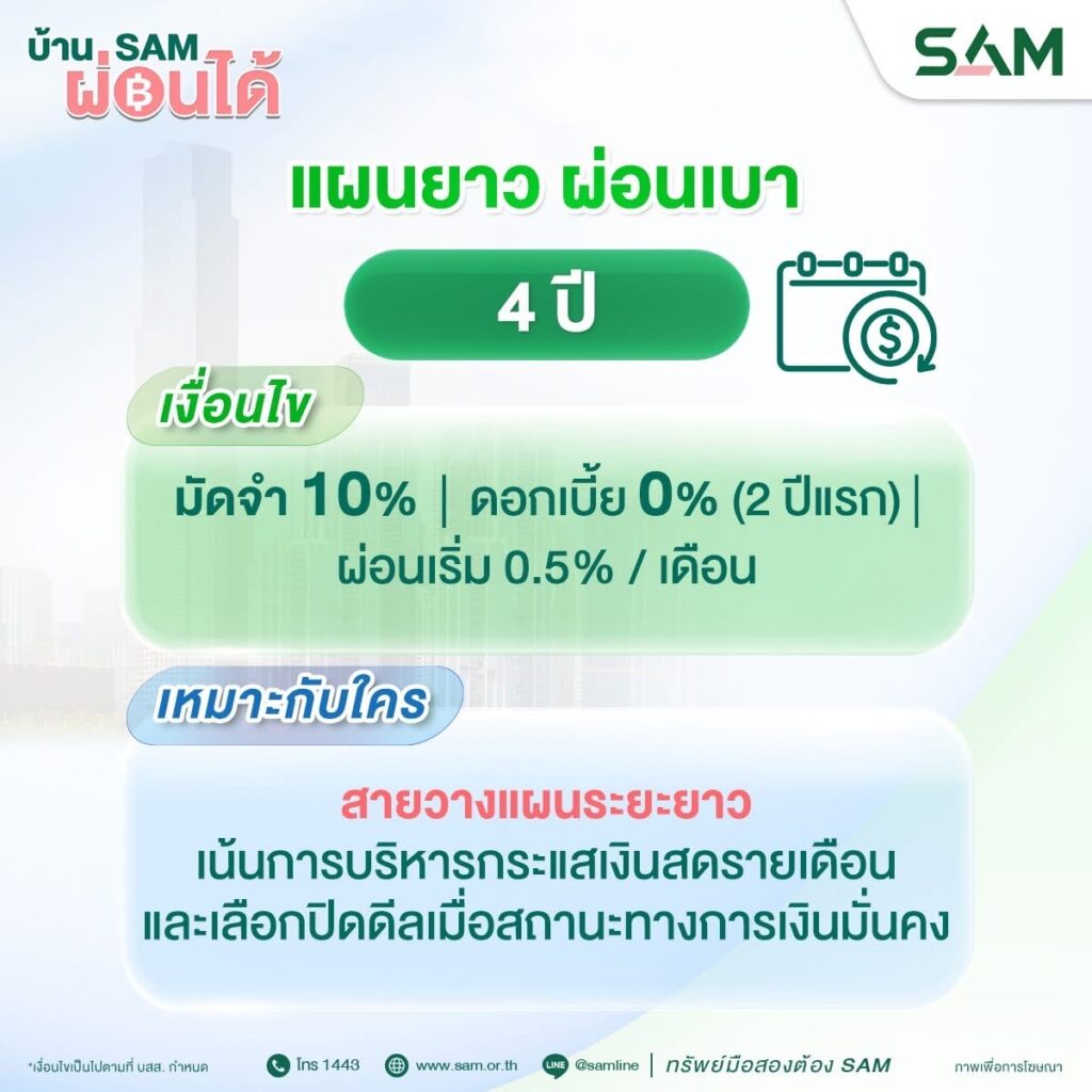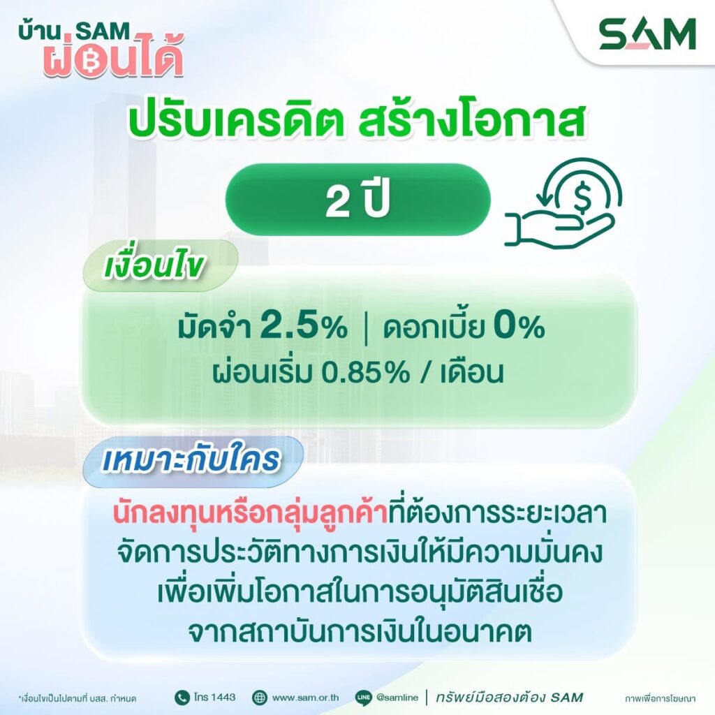 บริษัท บริหารสินทรัพย์สุขุมวิท จำกัด (บสส.) หรือ SAM เดินนหน้าภารกิจสำคัญ “ส่งมอบโอกาสเพื่อคนไทย เริ่มต้นใหม่อย่างยั่งยืน” เปิดตัวแคมเปญพิเศษ “บ้าน SAM ผ่อนได้” โดยคัดทรัพย์สินรอการขาย (NPA) ประเภทที่อยู่อาศัย  ไม่ว่าจะเป็น บ้านเดี่ยว ทาวน์เฮาส์ บ้านแฝด คอนโดมิเนียม และอาคารพาณิชย์ กว่า 3,300 รายการ  บนทำเลศักยภาพทั่วประเทศ ออกจำหน่ายพร้อมเงื่อนไขทางการเงินที่ช่วยประชาชนสามารถเข้าถึงที่อยู่อาศัยได้ง่ายขึ้น  โดยแคมเปญพิเศษ “บ้าน SAM ผ่อนได้” ดังกล่าว ลูกค้าสามารถผ่อนชำระโดยตรงกับ SAM  ได้นานสูงสุดถึง 4 ปี  พร้อมรับ อัตราดอกเบี้ยพิเศษ 0% ใน 2 ปี หรือ 24 เดือนแรก โดย SAM ได้ออกแบบเงื่อนไขการผ่อนชำระให้มีความยืดหยุ่นถึง 5 ทางเลือก เพื่อให้สอดคล้องกับรายได้และความสามารถทางการเงินที่แท้จริงของลูกค้าแต่ละราย และ พิเศษยิ่งขึ้น!! สำหรับลูกค้าที่ชำระเงินครบ 5% ของราคาประกาศขาย สามารถเข้าใช้ประโยชน์ในทรัพย์สินได้ทันที ภายใต้เงื่อนไขที่กำหนด