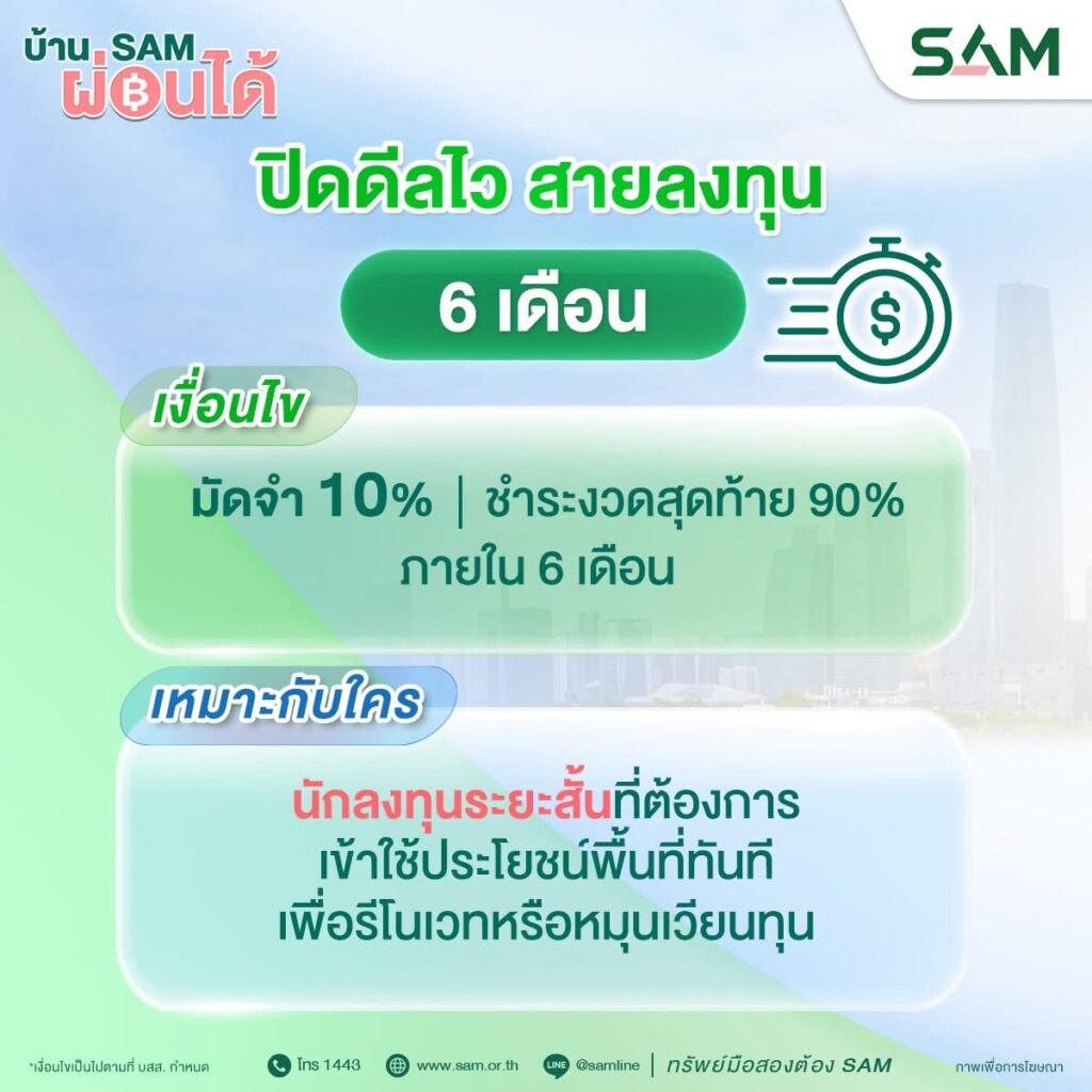 นอกจากนี้  SAM  ยังมีโปรโมชัน “SAM ทรัพย์มือสองต้องบอกต่อ” สำหรับลูกค้าที่แนะนำทรัพย์ของ SAM ให้กับเพื่อนหรือคนรู้จักมาซื้อทรัพย์ได้สำเร็จ  จะได้รับค่าแนะนำสูงสุดถึง 3 ล้านบาทต่อ 1 รายการ ภายใต้เงื่อนไขที่กำหนดอีกด้วย ลูกค้าที่สนใจสามารถสอบถามรายละเอียดเพิ่มเติมได้ที่ Call Center 1443  กด 2 และดูรายละเอียดทรัพย์สินได้ทางเว็บไซต์ที่ www.sam.or.th  รวมทั้งช่องทางออนไลน์ที่หลากหลายและสะดวกรวดเร็ว โดยแอด ID Line @Samline ติดตาม Facebook /YouTube / TikTok ได้ที่  “SAM บริหารสินทรัพย์สุขุมวิท”  เพื่อติดตามข้อมูลข่าวสารดี ๆ จาก SAM