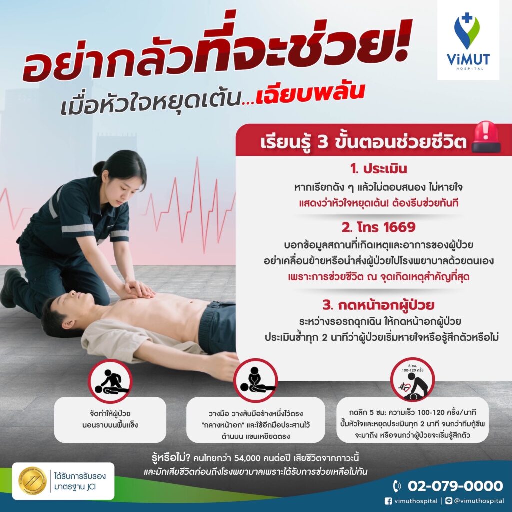 หัวใจของคนเราจะเต้น 60-100 ครั้งต่อนาที เพื่อสูบฉีดเลือดไปเลี้ยงส่วนต่าง ๆ ของร่างกายตลอดเวลา และหากหัวใจหยุดเต้นกะทันหัน เลือดจะไปเลี้ยงอวัยวะสำคัญไม่ได้ ทำให้หมดสติอย่างรวดเร็ว และภายในไม่ถึง 5 นาที เราอาจเข้าสู่ภาวะสมองขาดเลือดและเสียชีวิตได้ทันทีหากไม่ได้รับการช่วยเหลืออย่างทันเวลา ที่น่ากังวลคือ “ภาวะหัวใจหยุดเต้นเฉียบพลัน” เป็นภัยเงียบที่แทบไม่ส่งสัญญาณเตือนล่วงหน้า และเกิดขึ้นได้กับทุกคนแม้แต่คนที่แข็งแรงและออกกำลังกายเป็นประจำ โดยกรมควบคุมโรคเผยว่า คนไทยเสียชีวิตจาก “ภาวะหัวใจหยุดเต้นเฉียบพลัน” มากกว่า 54,000 รายต่อปีวันนี้ นพ.ราม บรรพพงษ์ เวชศาสตร์ฉุกเฉิน ศูนย์ฉุกเฉิน รพ.วิมุต จะมาเล่าถึงการรับมือกับภาวะหัวใจหยุดเต้นเฉียบพลันและเน้นย้ำถึงสิ่งที่ควรทำหากคนรอบตัวต้องเผชิญกับภัยร้ายนี้